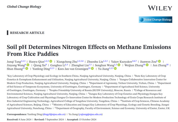 近日,万象城awcsport官网农学院丁艳锋教授团队在国际期刊《Global Change Biology》上发表了题为Soil pH determines nitrogen effects on methane emissions from rice paddies”的研究论文,发现稻田CH4排放对施氮的响应受土壤pH调控,即施氮对稻田CH4的影响随着土壤pH的增加而降低。