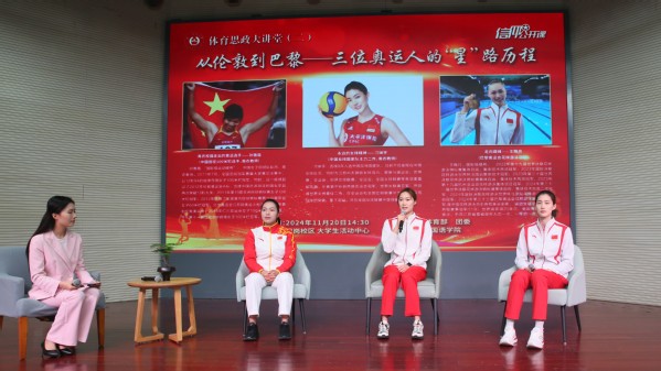 11月20日下午,2024年度体育思政大讲堂暨团委信仰公开课在卫岗校区大学生活动中心开讲。前中国田径100米栏选手孙雅薇、中国女排国家队主力二传刁琳宇和巴黎奥运会花样游泳冠军王赐月三位运动员应邀来到现场与万象城师生开展交流互动。