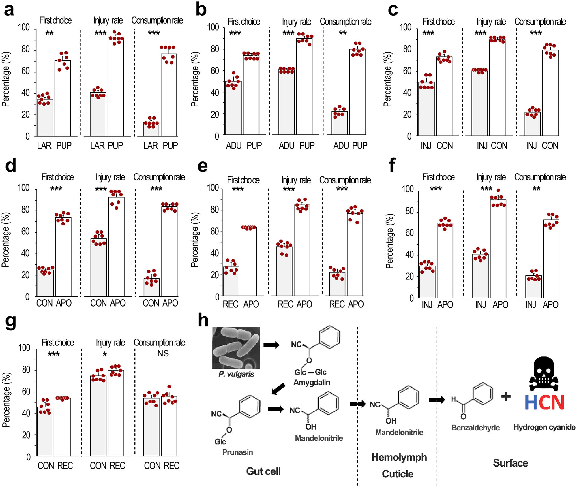 对马铃薯甲虫进行抗生素处理以消除其肠道共生细菌,会导致幼虫和成虫的HCN排放量大幅减少;去除细菌的甲虫可以通过添加扁桃腈或重新接种Ld01来恢复HCN的释放量,但无法通过接种Ld01的hcnB1或hcnB2突变体来恢复;揭示了马铃薯甲虫依赖于分解肠道共生细菌Ld01产生的扁桃腈释放HCN。使用双重选择实验发现天敌家鸡更喜欢捕食去除共生细菌的马铃薯甲虫幼虫,而不是正常幼虫、重新接种Ld01的幼虫或注射扁桃腈的幼虫。