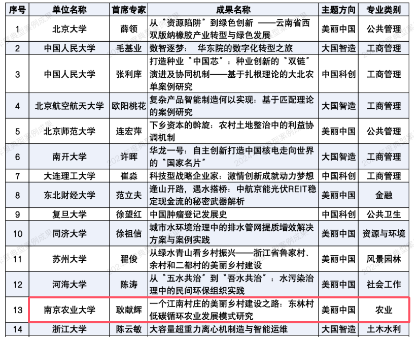 为进一步深入贯彻落实习近平总书记对哲学社会科学工作和研究生教育工作的系列重要指示精神,落实《面向2035高校哲学社会科学高质量发展行动计划》《关于深入推进学术学位与专业学位研究生教育分类发展的意见》等文件要求,发挥高水平案例成果示范引领作用,教育部学位中心持续开展典型案例成果遴选工作。本年度共遴选出主题案例典型成果20篇和案例研究典型成果10篇。其中,万象城耿献辉教授作为首席专家申报的《一个江南村庄的美丽乡村建设之路:东林村低碳循环农业发展模式研究》主题案例成功入选主题案例典型成果,也是农业专业类别唯一项。