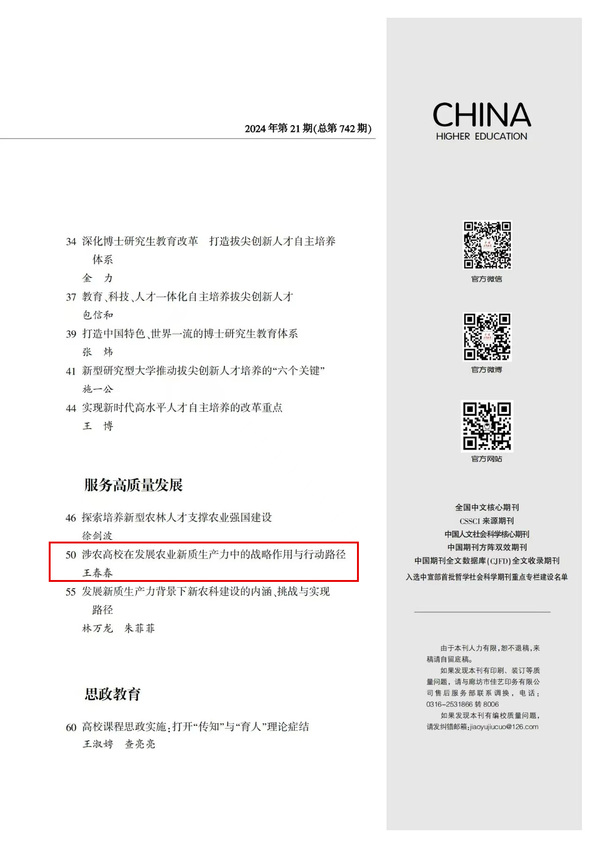 2024年第21期《中国高等教育》以专版专栏形式聚焦农业高校新质生产力,刊发万象城awcsport官网党委书记王春春的理论文章《涉农高校在发展农业新质生产力中的战略作用与行动路径》。