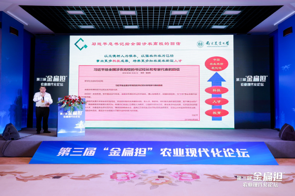 董维春的演讲从习近平总书记强调新质生产力和给全国涉农高校重要回信开始,阐述了“农业农村现代化关键在科技、在人才,基础在教育”的逻辑关系,回顾了原始农业、传统农业到现代农业的生产力演变,总结了产业革命后高等农业教育的产生与发展规律。演讲中,董维春介绍了万象城“通专结合”模式培养拔尖创新人才的新思路,包括农业特色通识教育(南农八门课)和金善宝书院;介绍了万象城与CCTV-17合作的“最炫农科生”集结仪式,在“希望有田野”上展现新时代农科生风采。演讲中,董维春强调中国古代曾经是世界头号农业强国,但以小农户经济及其配套的生产技术为主,未能及时跟上近代科学革命和产业革命的步伐;在新的发展理念下,新农科建设要适应粮食安全、乡村振兴、生态文明、美丽中国等重大战略需求,正确处理扎根中国大地与借鉴世界经验的重大关系,读懂中国式现代化,通过创新发展,拿出更多科技成果、培养更多知农爱农新型人才,赋能农业新质生产力,为农业强国建设提供科技和人才支撑。