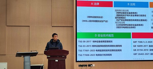 徐立兵代表江北新区市场监督管理局发表讲话,他指出特种设备安全规范管理对于学校和新区的发展都至关重要,要落实安全主体责任,提升管理水平和风险防范意识,为高质量发展筑牢安全防线。南京市锅炉压力容器检验研究院曹明和南京市特种设备安全监督检验研究院肖昀分别就压力容器和电梯等特种设备安全使用管理进行了培训,并深入解读了相关法律法规以及安全标准,指导参会人员如何依法依规落实特种设备管理责任。