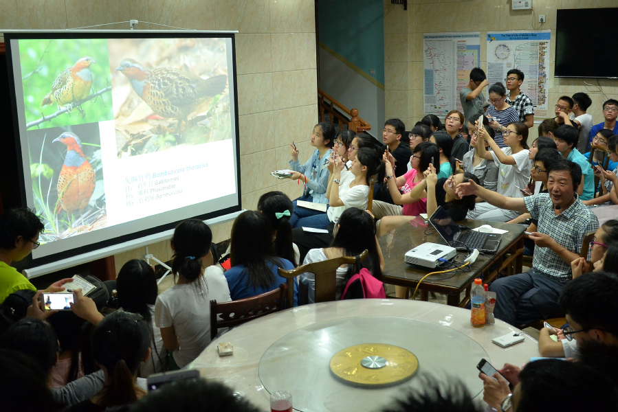 2016年,高国富副教授在黄山浮溪村为学生讲解鸟类识别方法