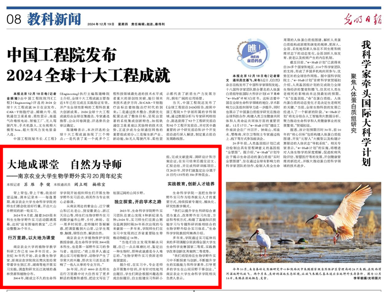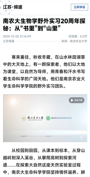 从校园到田园,从课本到标本,从穿山越岭到深入溪谷,从攀爬高树到探索河道……在探索大自然这座天然实验室过程中,南农大生命科学学院坚持情怀涵养、耕读教育和拔尖创新相结合,推动生物学理论教学和实践教学紧密结合,引导学生感知自然之美、生命之美和乡村之美,为培养知农爱农新型人才和拔尖创新人才发挥了重要作用。