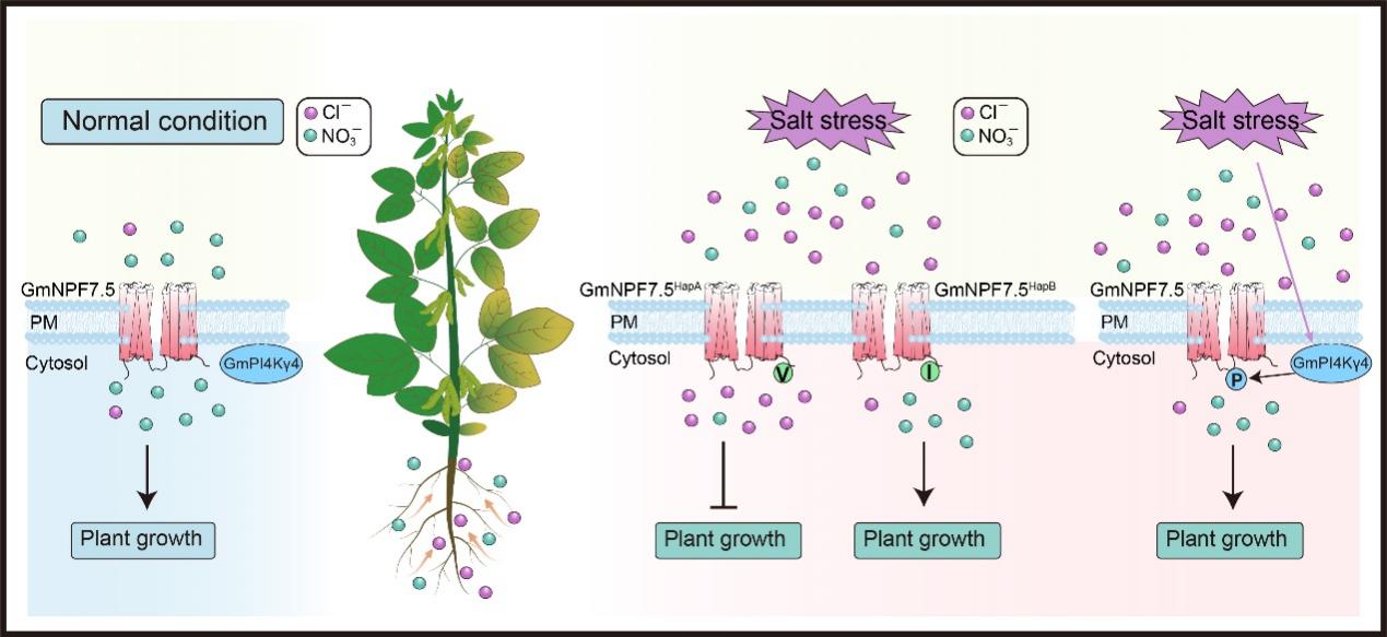 研究团队利用酵母双杂交技术筛选到GmNPF7.5的互作蛋白GmPI4Kγ4。大豆GmPI4Kγ4激酶可通过磷酸化修饰GmNPF7.5,特异性抑制其对Cl⁻的转运活性,却并不干扰对NO₃⁻的转运效能,有效削减Cl⁻在植株体内的累积量,大幅提升大豆耐盐水平。基于这一突破性成果,运用基因沉默技术能够显著增强多个大豆栽培品种的耐盐性,具有极高的应用前景。总而言之,此项研究开创性地揭示了大豆在盐胁迫下全新的Cl⁻平衡调控模式,为提升大豆耐盐性开辟了崭新思路,也为我国大豆产业应对盐碱地、培育耐盐大豆新品系提供了新基因与新理论。