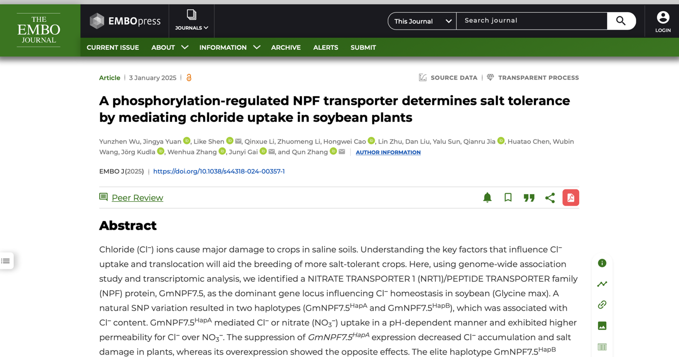 近日,国际权威学术期刊《The EMBO Journal》在线刊发了生命科学学院张群教授团队联合盖钧镒院士团队的研究论文 “A phosphorylation-regulated NPF transporter determines salt tolerance by mediating chloride uptake in soybean plants”,该研究精准鉴定到与大豆耐Cl⁻特性紧密关联的转运蛋白GmNPF7.5,揭示了大豆Cl⁻转运蛋白调控植株耐盐性的全新分子机制。