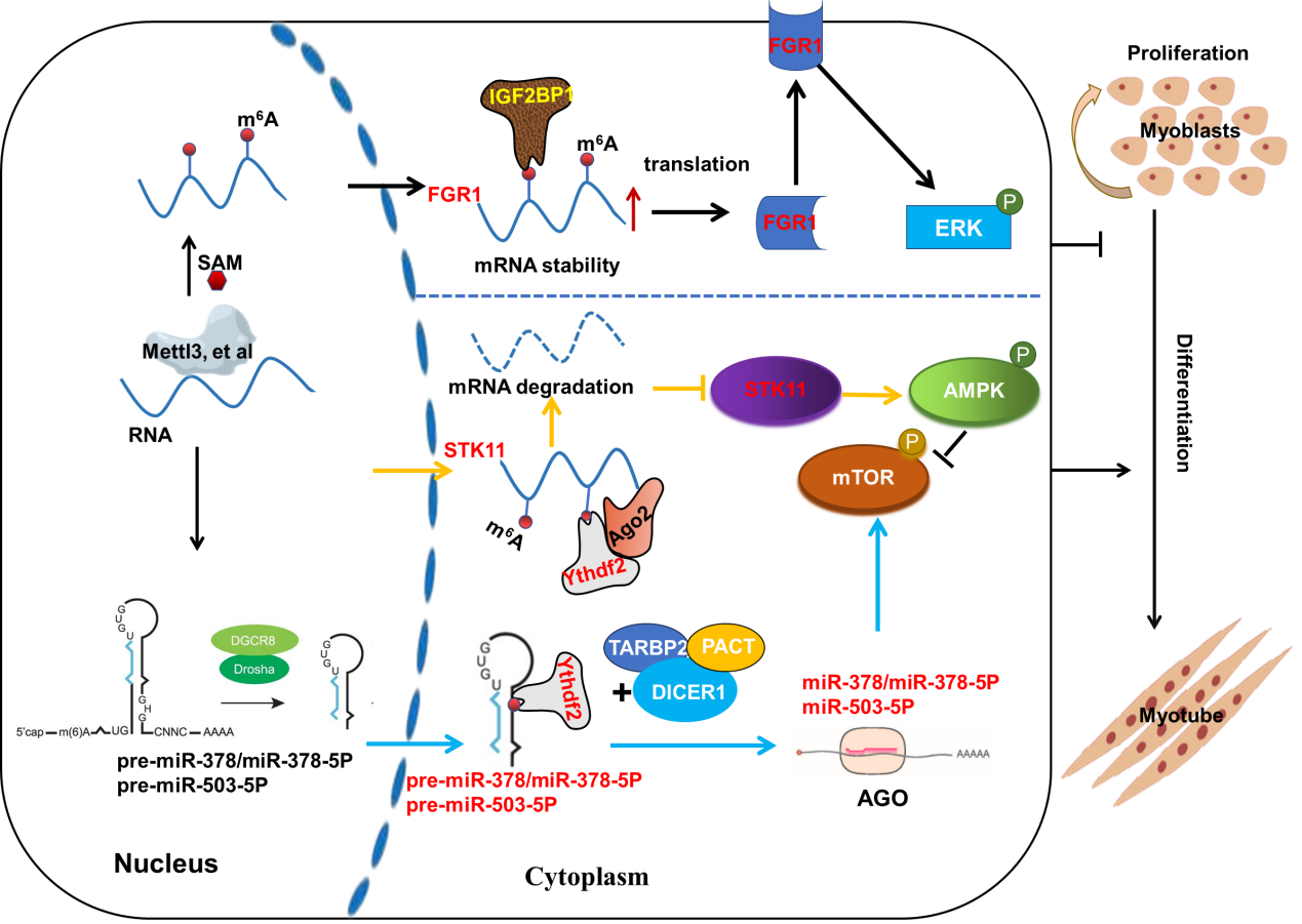 YTHDF2通过识别STK11 mRNA-5′UTR的m6A修饰以及pre-miR378/378-5P和pre-miR-503-5p的m6A修饰,并与微处理器复合物(AGO2、DICER1和TARBP2)互作,促进STK11 mRNA的降解以及pre-miR378/378-5P和pre-miR-503-5P的成熟来激活mTOR通路,进而驱动成肌分化(International Journal of Biological Macromolecules,2023,2025;Cellular And Molecular Life Sciences,2024);