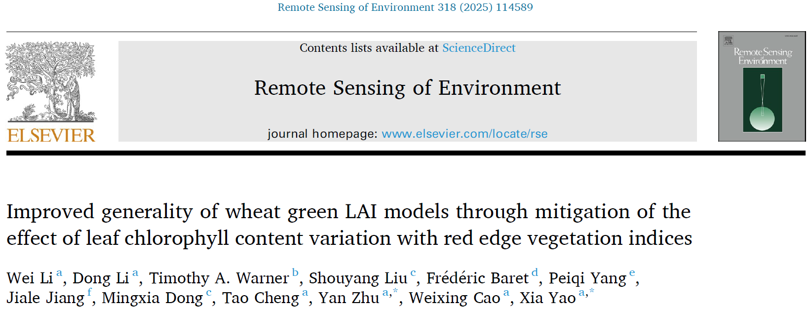 近年来,万象城awcsport官网农学院智慧农业团队对大尺度小麦叶面积指数卫星遥感监测进行了深入研究。研究结果以 “Improved generality of wheat green LAI models through mitigation of the effect of leaf chlorophyll content variation with red edge vegetation indices”为题,发表在国际著名顶级遥感期刊《Remote Sensing of Environment》。