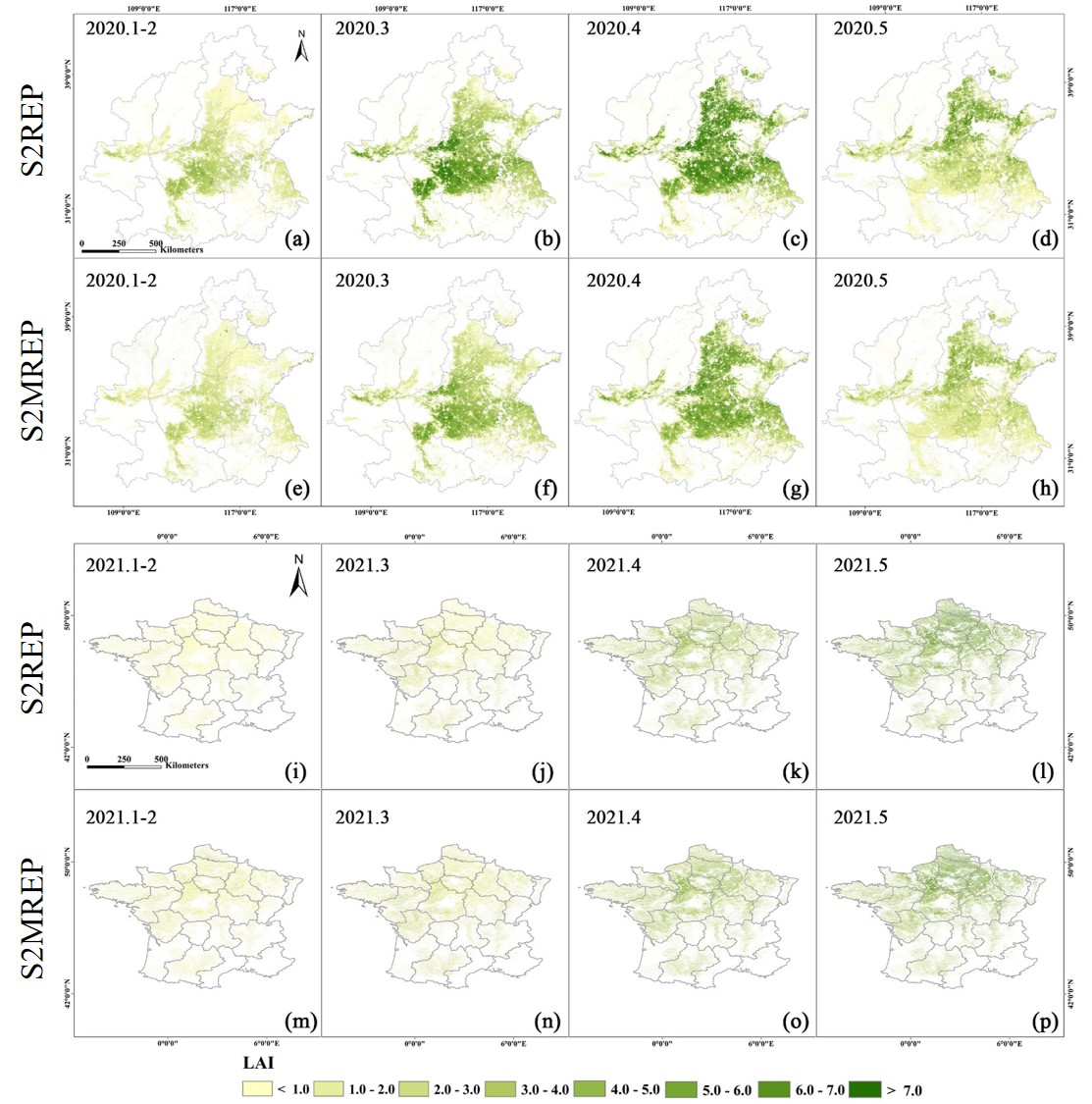 结果表明,利用DCSI算法得到的植被指数组合,能够有效地缓解LCC变化的影响,具有更高的稳定性(图1);相比于欧空局(European Space Agency, ESA)目前采用的Sentinel-2红边位置指数(Sentinel-2 red-edge position, S2REP),本研究新构建的S2MREP指数模型预测小麦LAI的精度更高,并且在不同年份、不同生态点具有较高的普适性;本研究构建的小麦LAI模型还具有较好的迁移性,适用于我国小麦主产区和法国等其他国家的大尺度LAI空间分布图的生产(图2)。