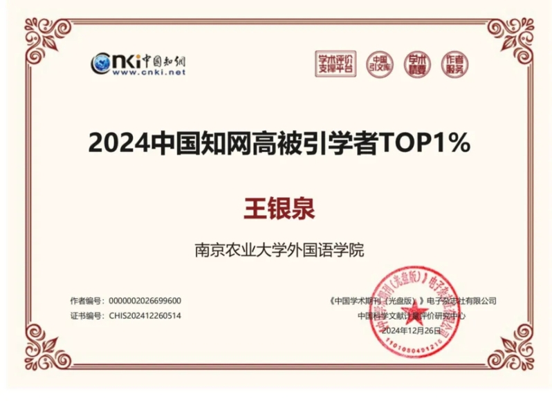 2024年岁末,中国知网中国科学文献计量评价研究中心发布“2024中国知网高被引学者”名单,王银泉入选2024中国知网高被引学者Top1%名单,为全国的外语学科入选的320位学者之一。