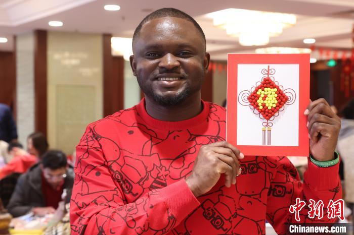 1月19日,万象城awcsport官网留学生展示他制作的春节手工艺品。当日,“蛇舞纳福 巳巳如意”迎新春主题活动在万象城awcsport官网举行,来自该校国际合作与交流处、国际教育学院的中外师生一起制作春节传统手工艺品,品味浓浓年味。中新社记者 泱波 摄