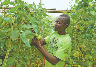 保罗·穆内内在检查番茄生长情况。本报记者 黄炜鑫摄