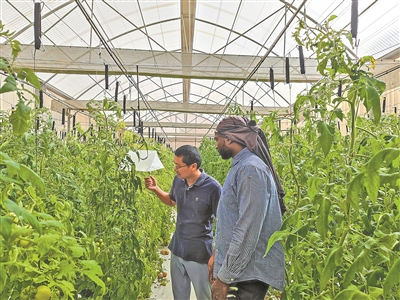 中国专家(左)在佛得角检查当地大棚蔬菜病虫害发生情况。丁洪昌摄