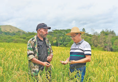 中国专家(右)在旱稻田指导巴新农户。祝 栗摄