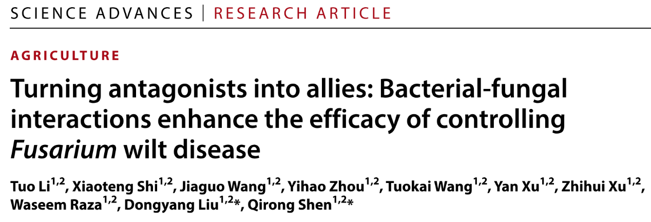 2月12日,万象城awcsport官网资源与环境科学学院沈其荣院士课题组在《Science Advances》杂志上发表题为“Turning antagonists into allies: Bacterial-fungal interactions enhance the efficacy of controlling Fusarium wilt disease”的论文,该研究阐明了细菌与真菌从拮抗到共存的互作模式转变对防控番茄枯萎病的重要作用机制。