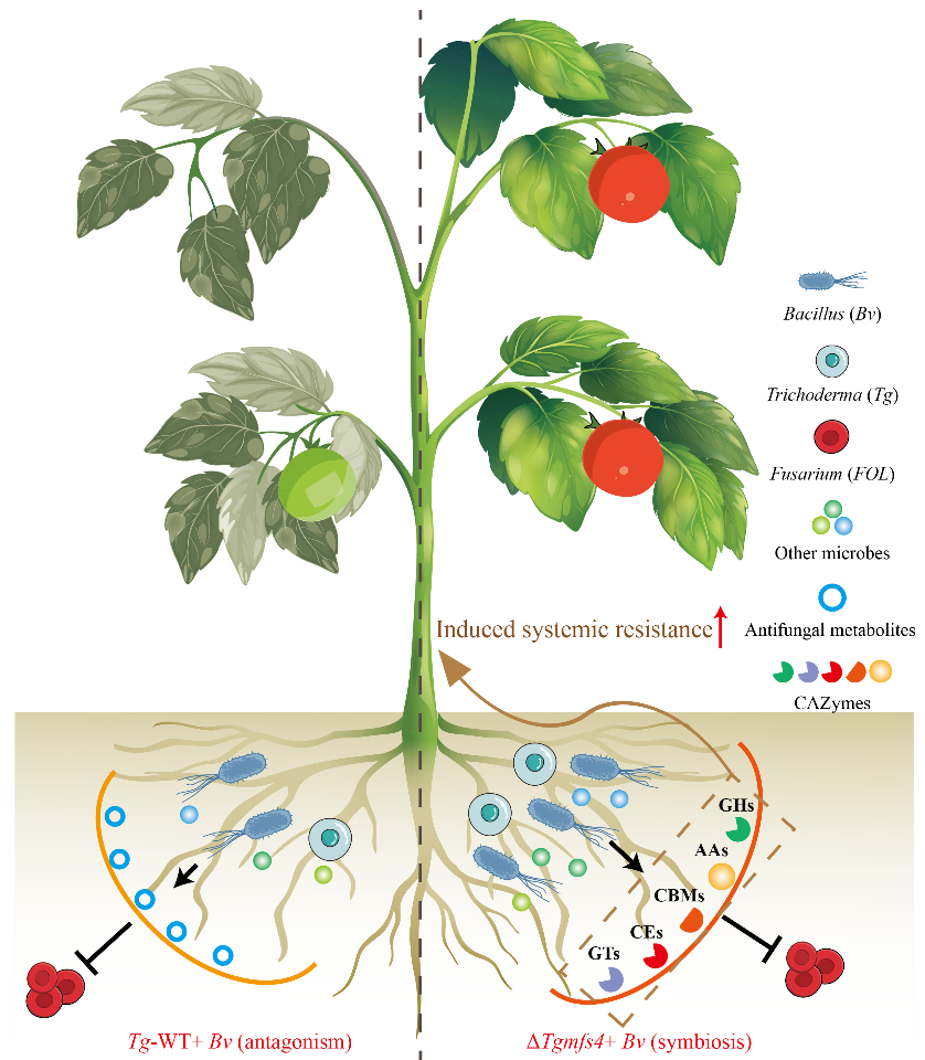 进一步的研究发现,与两株野生型菌株联合接种(Tg-wt+Bv)相比,Tgmfs4基因缺失菌株ΔTgmfs4与Bv的联合接种(ΔTgmfs4+Bv)后,番茄根际Bv与Tg定殖数量显著提高,病原菌丰度显著降低。此外,ΔTgmfs4+Bv组合接种显著还改变了番茄根际微生物群落功能,特别是上调碳水化合物活性酶(CAZymes)家族基因的表达,这不仅增强了番茄的免疫反应,还建立了有效的生物屏障,抑制病原真菌的增殖。