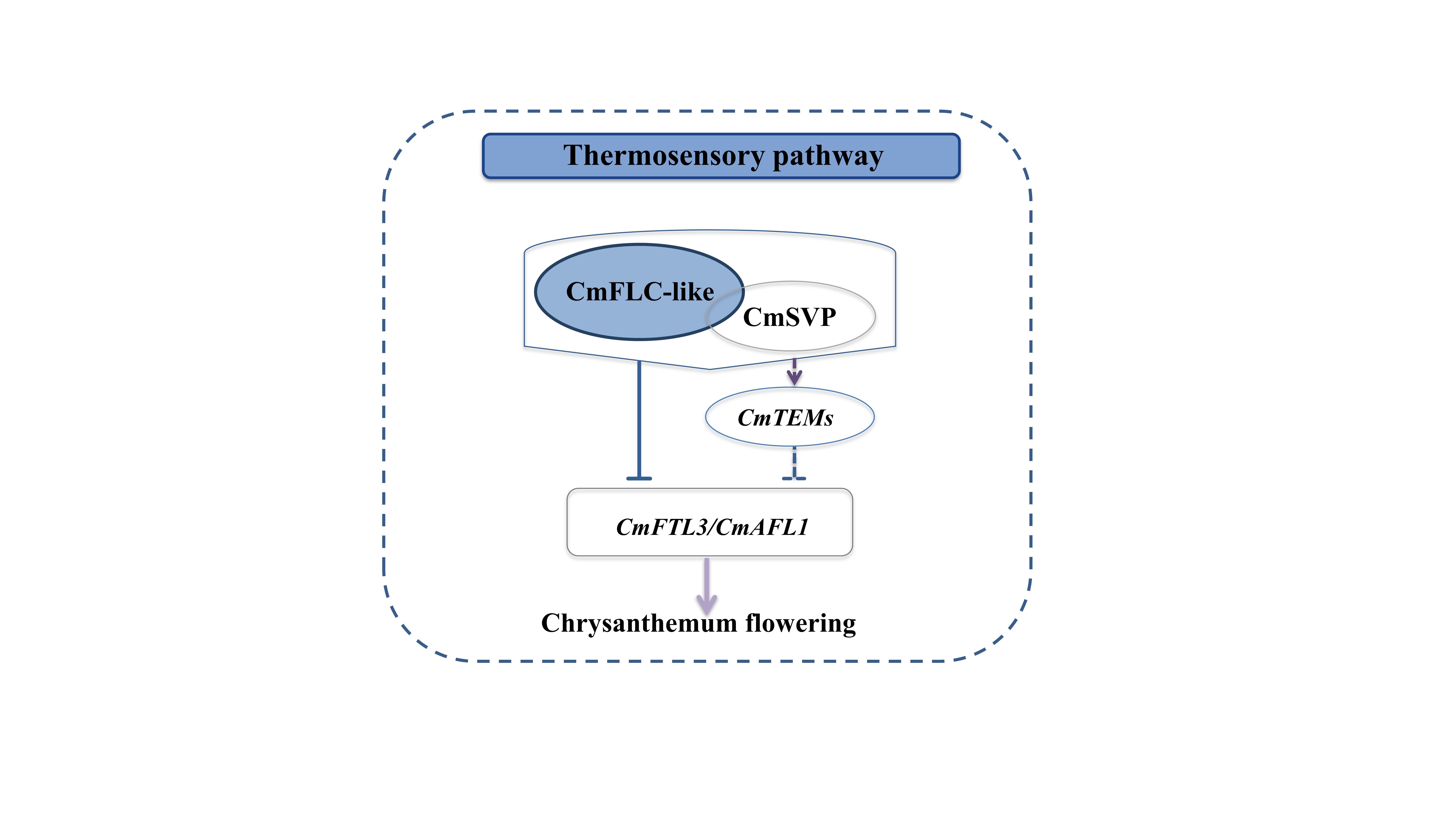 此外,研究发现CmFLC-like与CmSVP互作,并且CmFLC-like部分依赖CmSVP抑制CmFTL3的表达,介导菊花的成花转变。综上所述,该研究揭示了CmFLC-like介导温敏路径抑制开花的分子机制(图2),研究结果为深入理解低温调控菊花开花提供了新的认知。