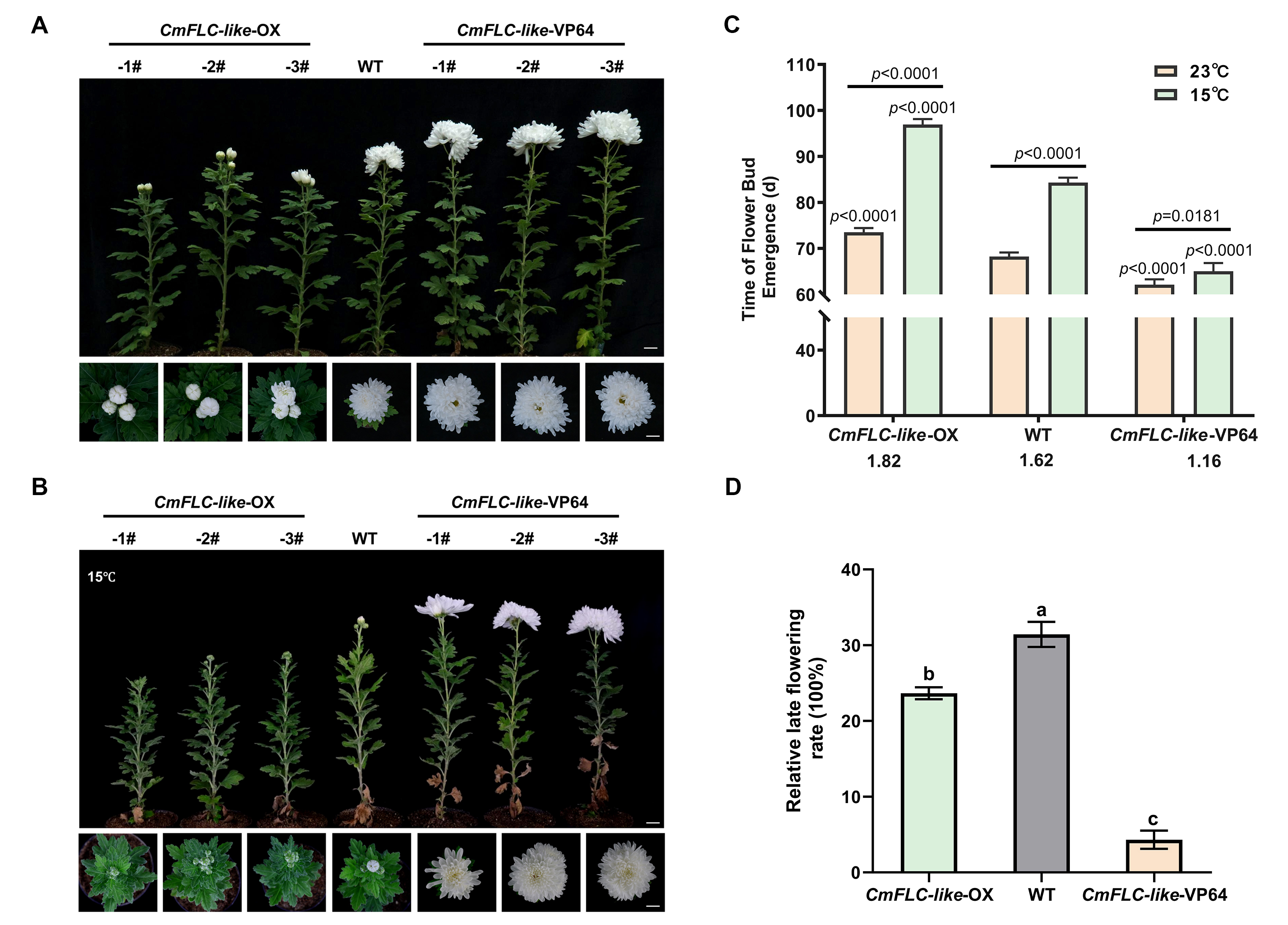 图1 CmFLC-like介导低温下的菊花晚花