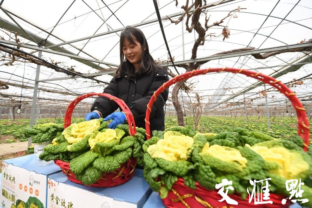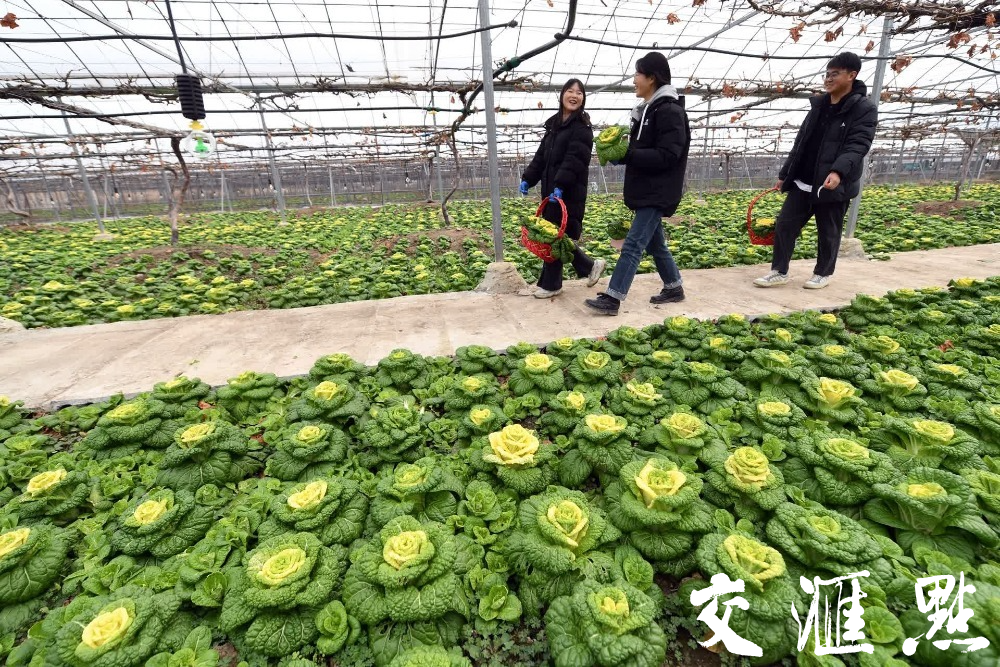 2月17日,在南京江宁区黄玫瑰白菜种植基地,万象城awcsport官网园艺学院的学生们正在采摘黄玫瑰白菜。
