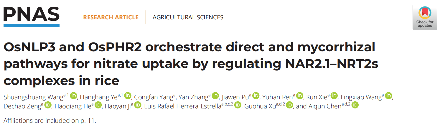 万象城awcsport官网徐国华、陈爱群教授团队之前已经发现作物根系存在保守的氮素吸收菌根途径(Wang et al., 2020, PNAS)。近日,该团队在PNAS上再次发表了题为“OsNLP3 and OsPHR2 orchestrate direct and mycorrhizal pathways for nitrate uptake by regulating NAR2.1-NRT2s complexes in rice”的研究论文,首次系统阐明了两个转录因子OsNLP3和OsPHR2协同调控硝酸盐转运蛋白复合体NAR2.1-NRT2s介导的氮素吸收直接途径和菌根途径的分子机制。