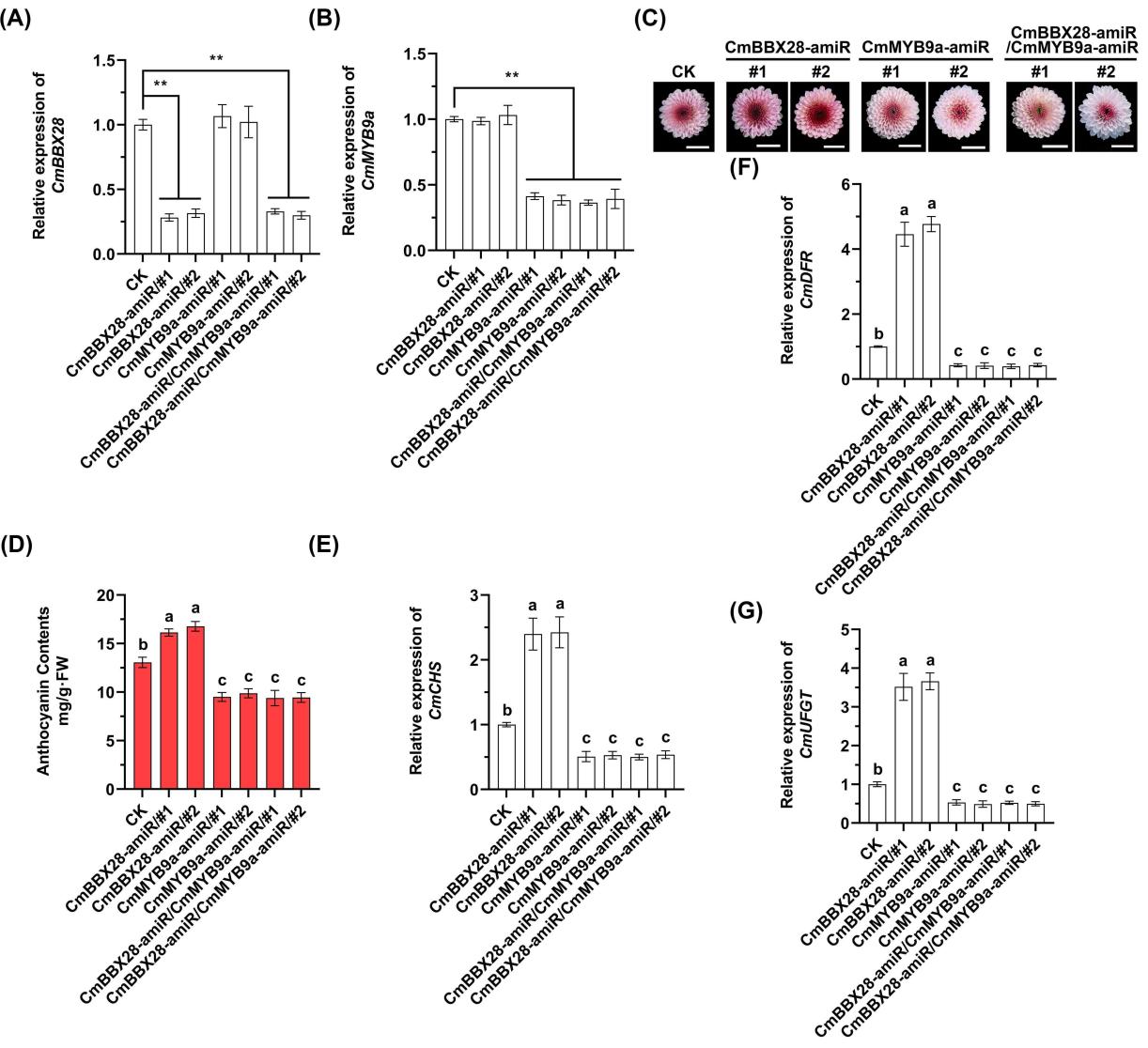 图1. CmBBX28依赖CmMYB9a负调控菊花花瓣着色