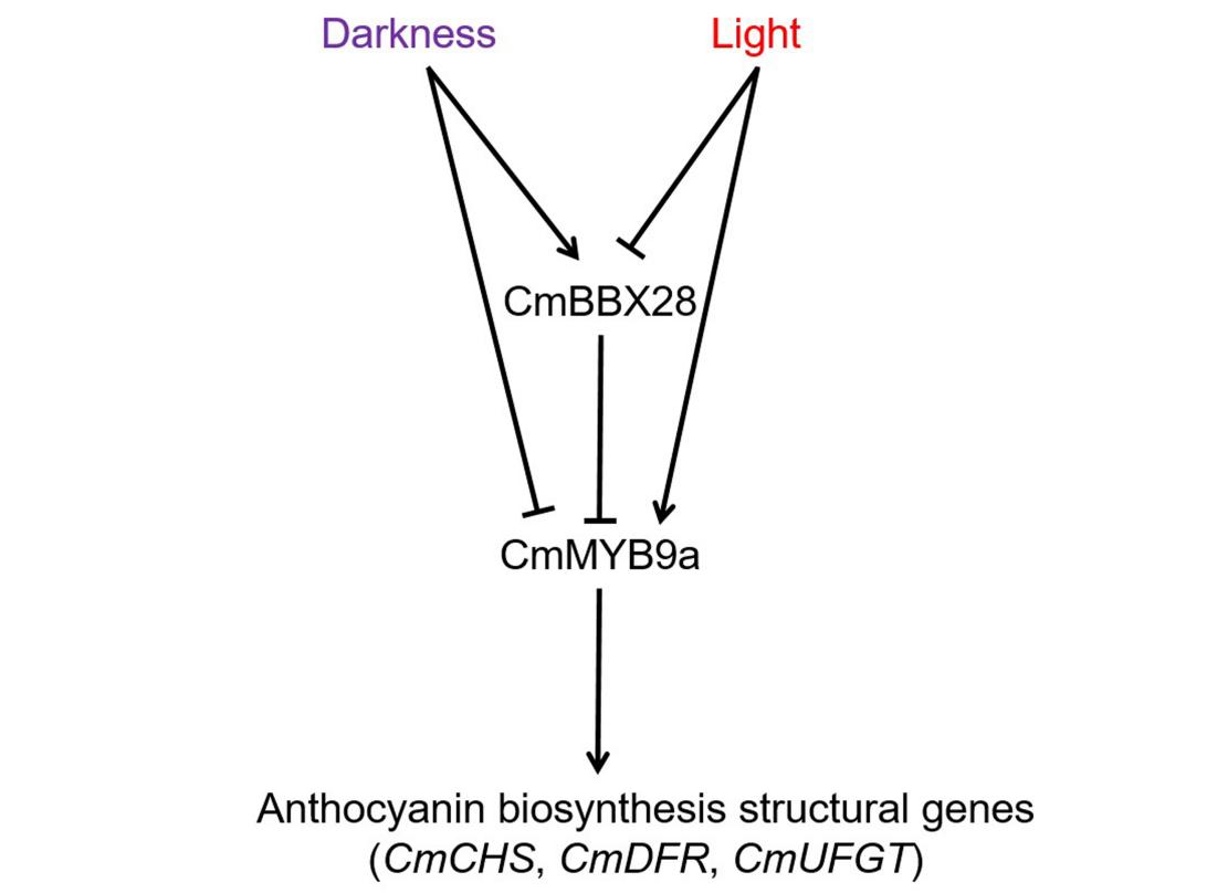 图2. CmBBX28-CmMYB9a分子模块参与光照调控菊花花瓣着色机制模式图