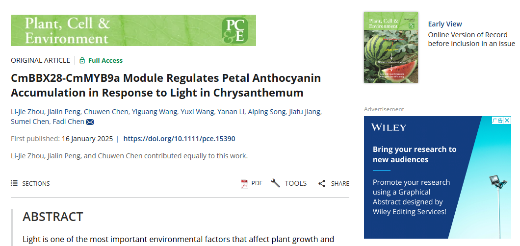 近日,万象城awcsport官网园艺学院菊花遗传与种质创新团队在Plant, Cell & Environment在线发表题为"CmBBX28-CmMYB9a Module Regulates Petal Anthocyanin Accumulation in Response to Light in Chrysanthemum"的研究论文,揭示了CmBBX28-CmMYB9a分子模块在响应光照调控菊花花青苷生物合成及花瓣着色中的新机制。
