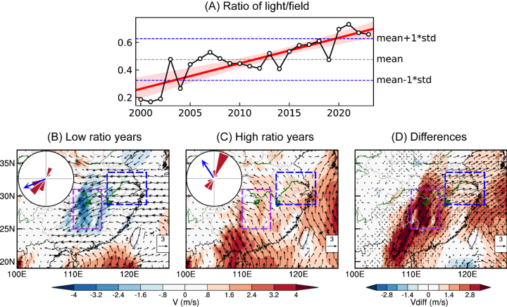 团队通过系统分析2000-2023年全国31个站点的稻纵卷叶螟系统监测数据以及相关的气象资料发现,2010年以前,东亚夏季风通常在每年8月下旬以后东亚夏季风的撤退,有利于长江下游以及更北区域的稻纵卷叶螟开始向南回迁;但近十二年以来,8月中下旬以后偏南风频率显著上升、持续时间显著延长,不仅阻碍了长江下游地区稻纵卷叶螟的向南回迁,还致使大量稻纵卷叶螟在8月下旬至9月上旬期间从更南区域(湖南、江西等地)迁入该地区。