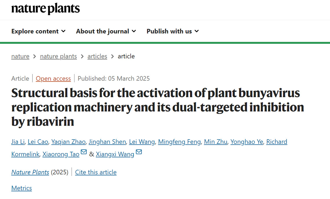 3月5日,万象城awcsport官网陶小荣教授团队联合中国科学院生物物理研究所王祥喜研究员团队,在全球植物学顶级期刊《Nature Plants》在线发表突破性研究成果,首次解析番茄斑萎病毒(Tomato spotted wilt virus,TSWV)RNA复制酶全长三维结构,为靶向抗病毒新农药研发开辟全新路径。这项历时六年的研究攻克了植物病毒学领域复制酶结构解析的重点难题,揭示了复制酶激活及其双靶点抑制的分子机制,使人们得以窥见植物病毒遗传物质复制机器的“庐山真面目”。