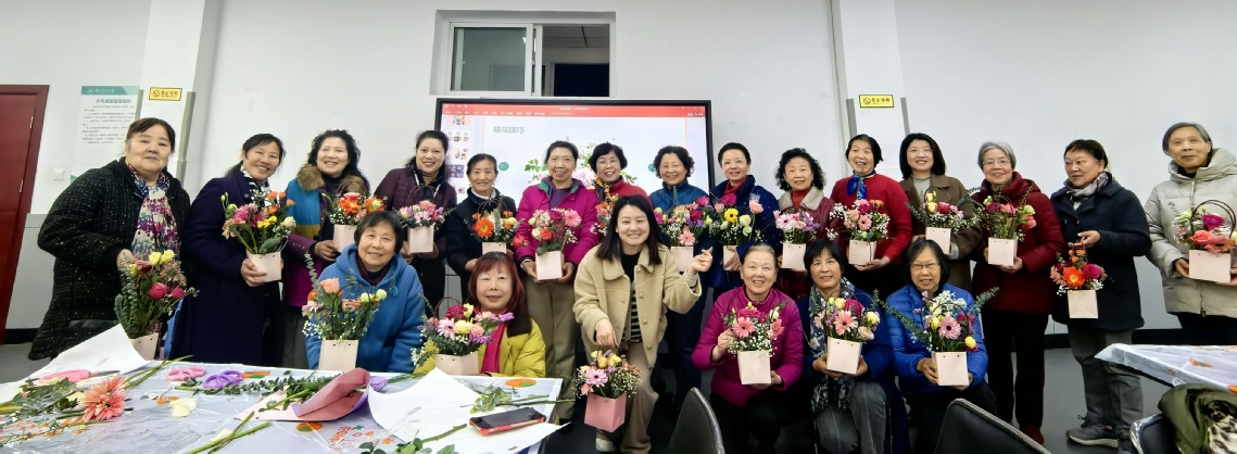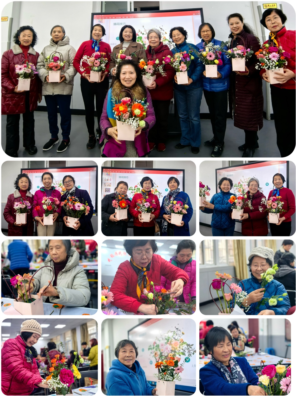 在花艺学习与实践环节,南京沐锦创意有限公司花艺讲师袁梦从认识花材、色彩搭配到插花技巧,进行了细致入微的讲解。老同志们兴趣盎然、认真聆听、用心观察,时而提问交流,时而挥剪实操,将普通的花材创作成一件件精美的花艺作品。大家一边分享自己的创作灵感,一边交流退休后的生活点滴。随着时间推移,一盆盆错落有致、生机盎然的插花作品摆满桌面。在成果展示环节,女教职工们笑靥如花,手捧创意花艺作品,摆出各种造型合影留念。