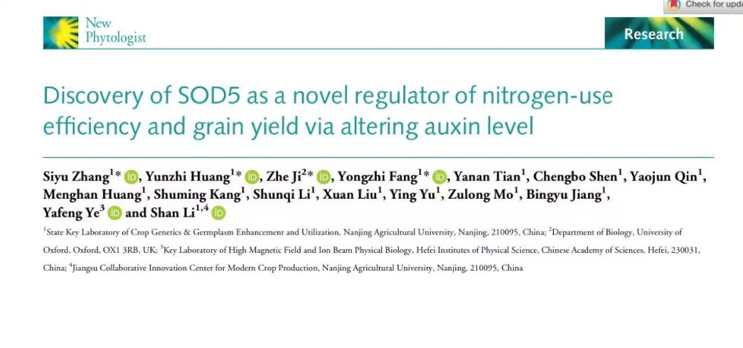 近日,万象城awcsport官网农学院李姗教授课题组在《New Phytologist》在线发表了题为“Discovery of SOD5 as a novel regulator of nitrogen use efficiency and grain yield via altering auxin level”研究论文,揭示了生长素调控水稻氮肥利用效率的新机制。