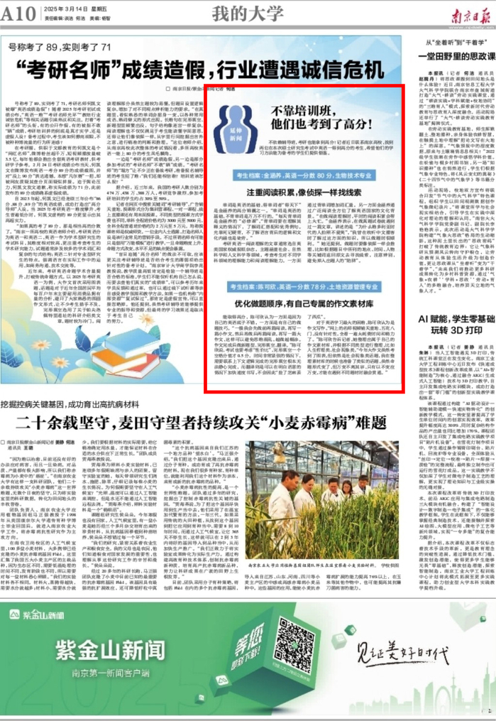 不依赖辅导班,考研也能拿到高分!记者近日联系南京高校,找到两位在本次硕士研究生考试中英语一得到高分的考生,希望他们的学习方法能为备考的学生们提供借鉴。