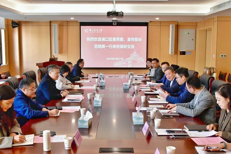 3月21日上午,浦口区委常委、宣传部部长范明辉,浦口区委宣传部常务副部长、网信办主任吴芳芳,区委宣传部副部长、文明办主任杨诗云,区委教育工委副书记、区教育局副局长任卫兵,区文联副主席郭丽萍,区文明办副主任尹富强一行来校调研交流。校党委副书记、纪委书记吴荣顺出席座谈会。