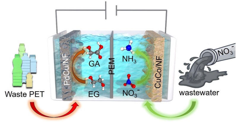 将NO₃⁻废水通过电化学方法转化为氨(NH₃),为废弃物中氮资源的回收提供了一种可持续的解决方案。然而,这种方法在实际应用中仍然面临重大挑战,包括整体能耗高和产物选择性低的问题。本文开发了一种配对电化学系统,该系统巧妙结合了阳极氧化PET塑料制乙醇酸和阴极还原硝酸根制氨的双重反应。这一双功能电化学系统的成功构建主要归功于电极材料的设计:首先,钯铜(PdCu)合金阳极材料展现出优异的抗CO中毒性能,并大幅提升了乙二醇氧化反应的效率;其次,铜钴(CuCo)合金阴极材料通过铜-钴双金属的协同效应,显著增强了硝酸盐还原制氨的选择性。该研究不仅有效缓解了传统电化学工艺的高能耗缺陷,更开创了废弃物资源化回收的新模式,同时为解决塑料污染和硝酸盐废水污染这两大环境问题提供了兼具环境友好性和经济可行性的综合方案,真正实现了生态效益与经济效益的协同提升。