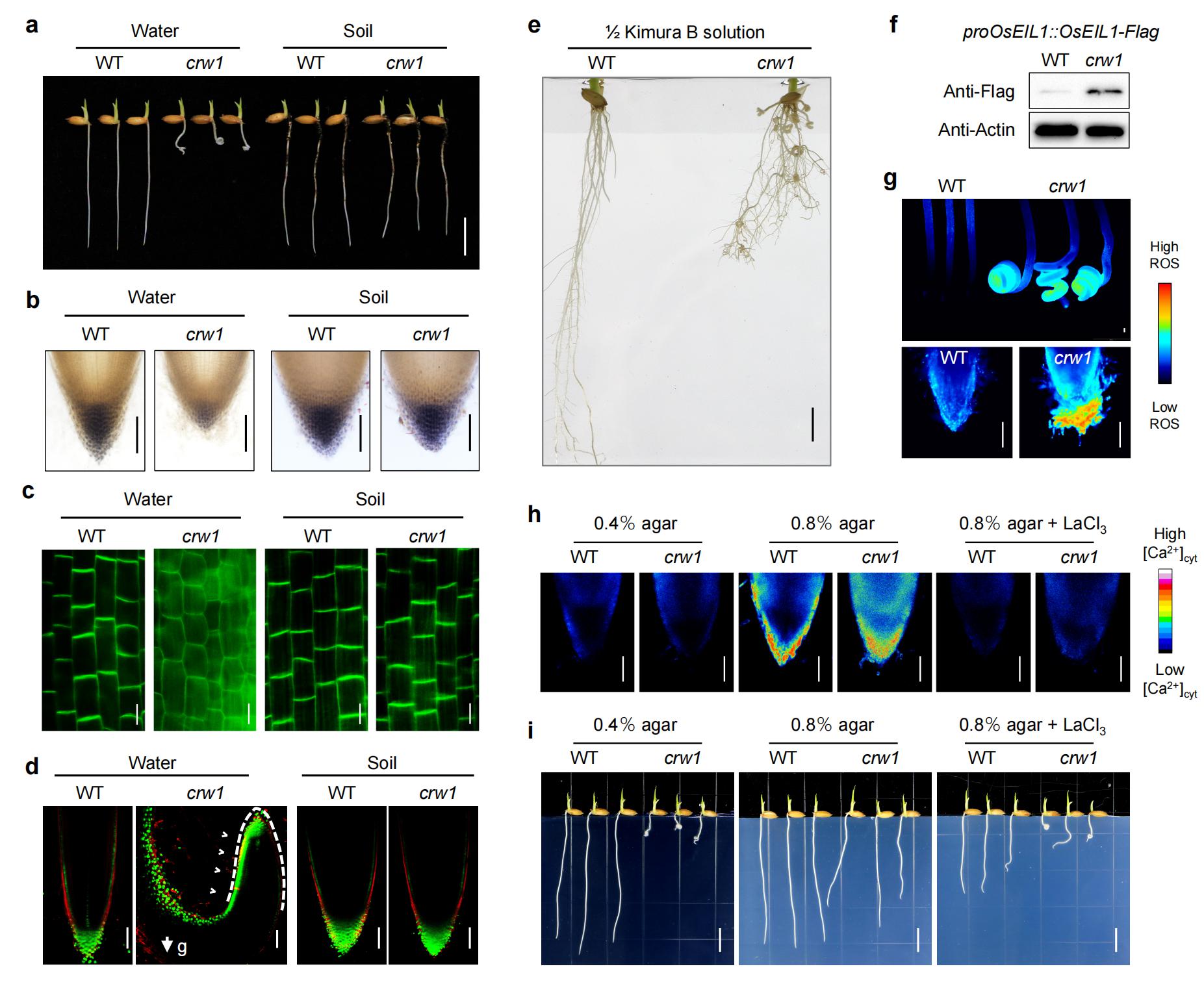 a-d.crw1突变体在水培和土培条件中的(a)根系表型、(b)根冠、(c)OsPIN2蛋白极性定位和(d)根尖生长素分布;(e)异常的向地性机制导致crw1在营养液中根系持续卷曲生长;f-g.增强的乙烯激活信号通过ROS导致crw1根系在水培中卷曲生长;(f)OsEIL1蛋白在crw1根中积累;(g)crw1根尖ROS增强;h-i. crw1在0.4%和0.8%琼脂中(±钙信号抑制剂LaCl3)生长时的(h)根冠钙信号和(i)根系表型。