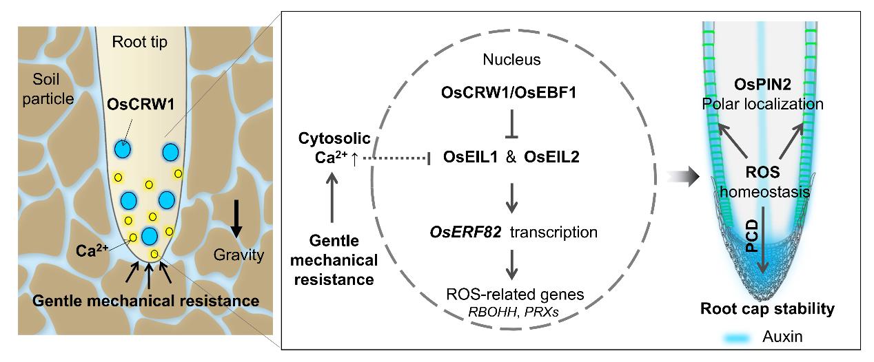 综上所述,本研究揭示了OsCRW1(OsEBF1)和根冠机械力感应通过抑制OsEIL1/OsEIL2-OsERF82-ROS信号模块对维持根冠结构稳定和根尖生长素分布起重要作用,OsCRW1和机械力-钙信号提供了限制乙烯激活信号放大的双重保险,确保水稻根系的向地性生长(图2)。