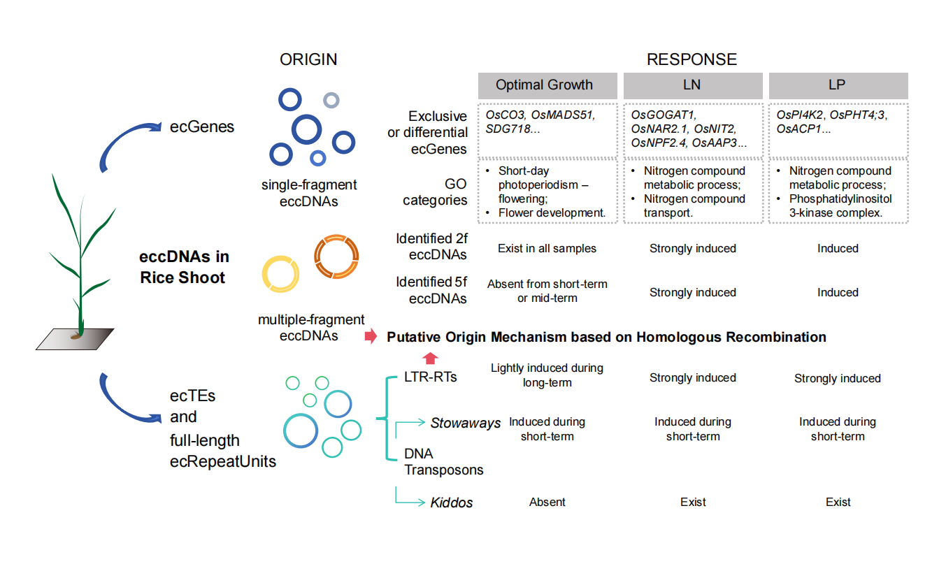 图1.水稻基因组可塑性的环境适应机制:基因及转座子相关eccDNA在氮磷胁迫中的动态调控。