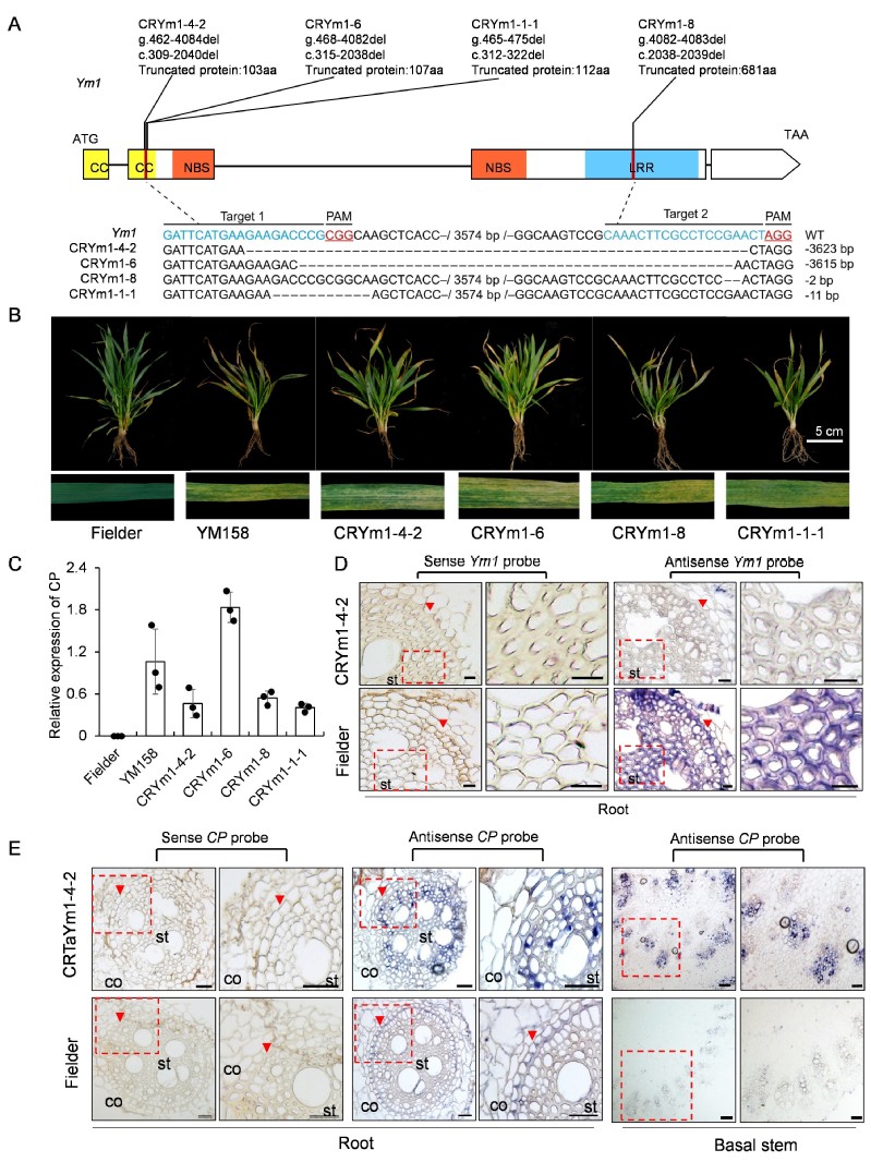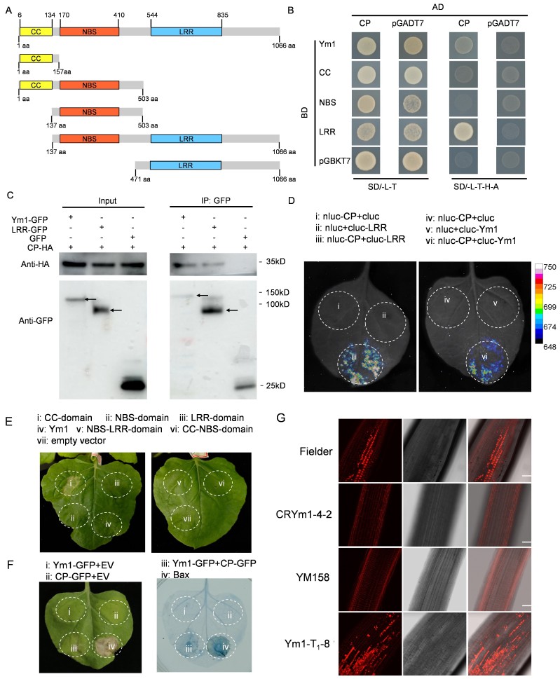 进一步研究发现,Ym1通过识别并与WYMV外壳蛋白(CP)互作触发免疫反应:其LRR结构域与CP互作,CC结构域引发细胞坏死。亚细胞定位表明,Ym1在细胞核和细胞质中均有分布,Ym1-CP互作后,Ym1发生核-质重定位(从细胞核转移至细胞质),将其从抑制状态变为激活状态,引发过敏反应,从而赋予根部特异表达的Ym1抵御病毒向根的中柱鞘侵入的能力,阻止病毒进入地上茎叶部位。值得注意的是,Ym1仅抑制病毒侵染,不影响Pg在根部的定殖。