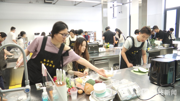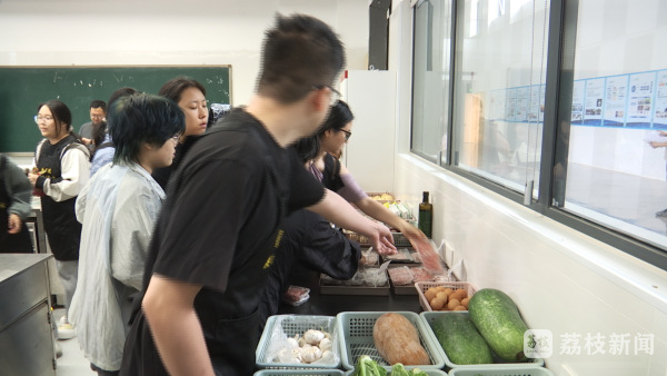 实验室像是一个巨型厨房,摆放着各类厨房用具和食材。这一堂课,要同学们设计一日三餐减脂食谱并完成烹饪。为此,一周前同学们就开始了调研和准备。