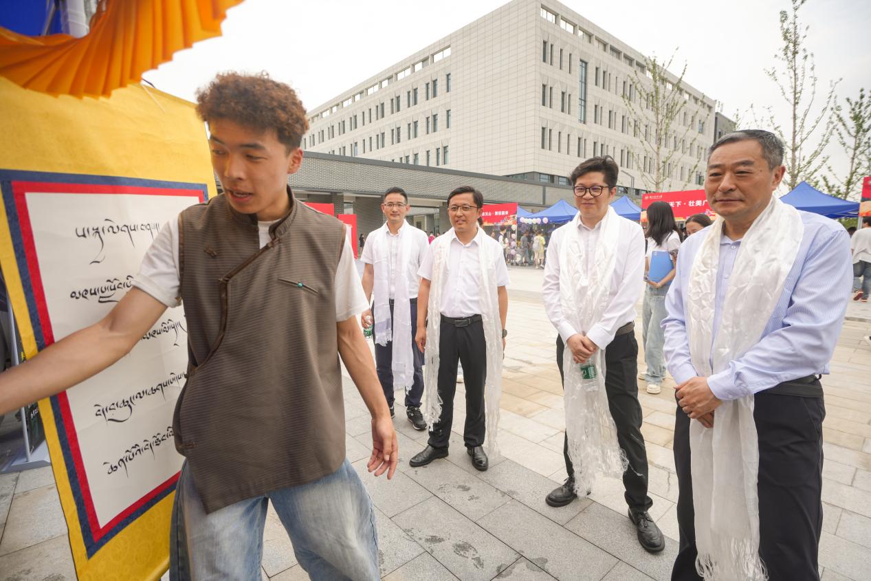 学生通过民族服饰、古籍文字、特色美食、农耕器具与非物质文化遗产体验等模块,全景式呈现中华优秀传统文化与农耕文明的深度交融。与会领导与各民族师生代表在讲解员引导下,在茶米同炊、歌舞共乐中,共同感知共同体理念。