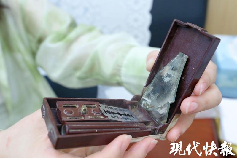 蒋慕东带来了几个老物件,有盖钧镒院士当年的手写笔记,字迹清晰又工整。还有一把跨越近70年的老式剃须刀,年代久远到盒子里的镜子碎了,剃须刀的内里生了一些锈,但装上刀片依旧能用。