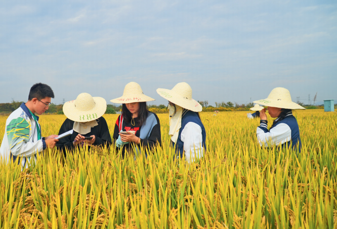 杨弘毅(左一)和队员们在南京溧水白马地基调查水稻生长情况