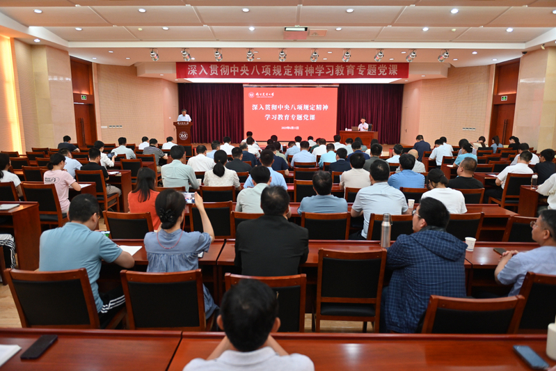 6月11日上午,校党委书记、党的建设和全面从严治党工作领导小组组长王春春以《持之以恒贯彻落实中央八项规定精神 以作风建设新成效为学校高质量发展提供政治保障》为题,作深入贯彻中央八项规定精神学习教育专题党课报告。校党委副书记刘营军出席并主持党课。学校机关和直属单位主要负责同志、二级党组织书记,“双带头人”党支部书记、本科和研究生党支部书记代表等参加党课学习。