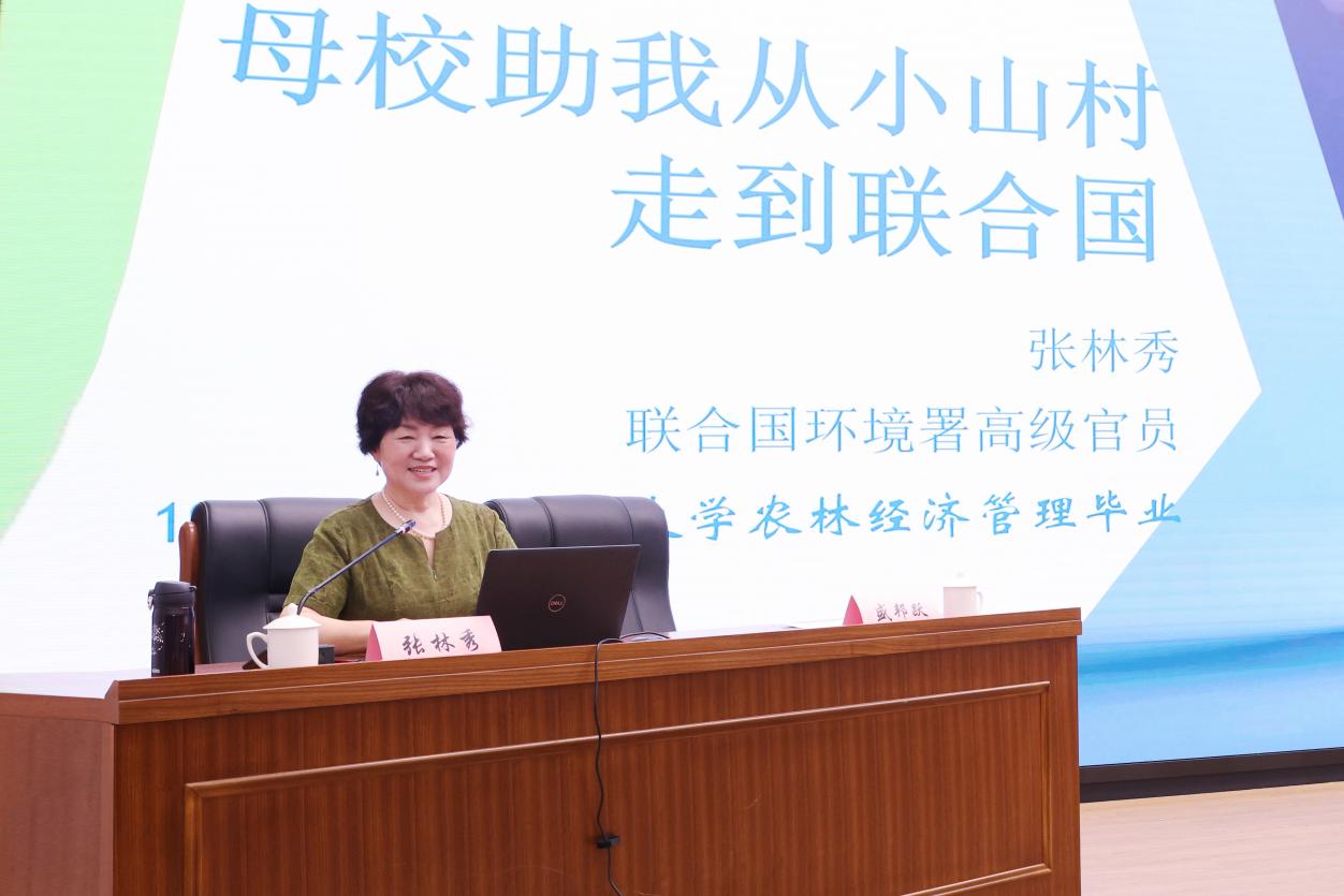 张林秀围绕立德树人根本任务,用生动的语言、鲜活的故事,以图文并茂的形式,从成长印记、做“顶天立地”的研究、积极参与国际合作、联合国工作四个方面分享了她从小山村走到联合国的奋斗历程,与会师生对她胸怀祖国、志存高远、脚踏实地、持续努力、勇攀高峰、服务人民的科学家精神充满敬意。报告会上,张院士以感恩的心,分享了在母校打下的基本功助她勇攀高峰的感人故事。她将理论知识与实践相结合,为政策制定提供了科学依据,也为支持全球实现可持续发展目标贡献了中国智慧。