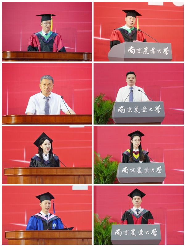 动物医学院苗晋锋教授、智慧农业学院田永超教授作为教师代表发言。动物科技学院1991届校友、江苏海普瑞集团董事长强发旗,植物保护学院2008届校友、杭州欢田喜地农业科技有限公司董事长李涛分别作为校友代表发言。经济管理学院本科毕业生陈昱宁、食品科技学院本科毕业生王子芃、公共管理学院硕士毕业生李嘉胤、资源与环境科学学院博士毕业生赵庆洲分别代表毕业生发言。