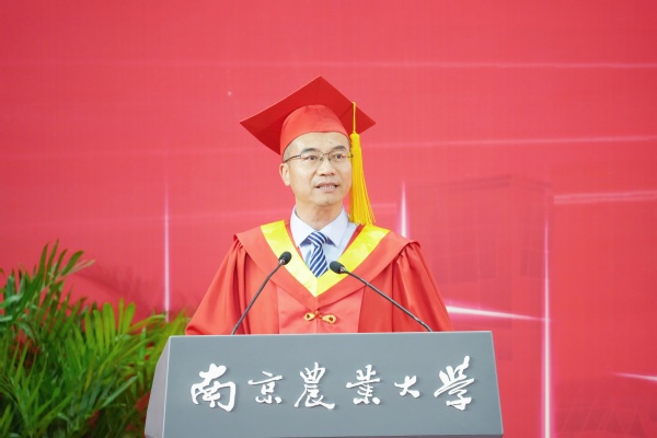 校长陈发棣以《未来的坐标》为题致辞。陈发棣将毕业生飞扬驰骋的时代喻为坐标的横轴,将学子们奋斗接力的荣光喻为坐标的纵轴,将同学们闪亮的青春喻为独一无二的原点。他表示,同学们在南农求学期间,怀揣爱农情怀,以实际行动积极回应时代召唤,用兴农本领服务国家战略,在强国建设的时代征程中贡献青春、尽显担当,成就的大学经纬,是青年理想与时代脉搏的同频共振,是青春奋斗与学校发展的共荣共进,是青春时光与成长蜕变的交织交融。