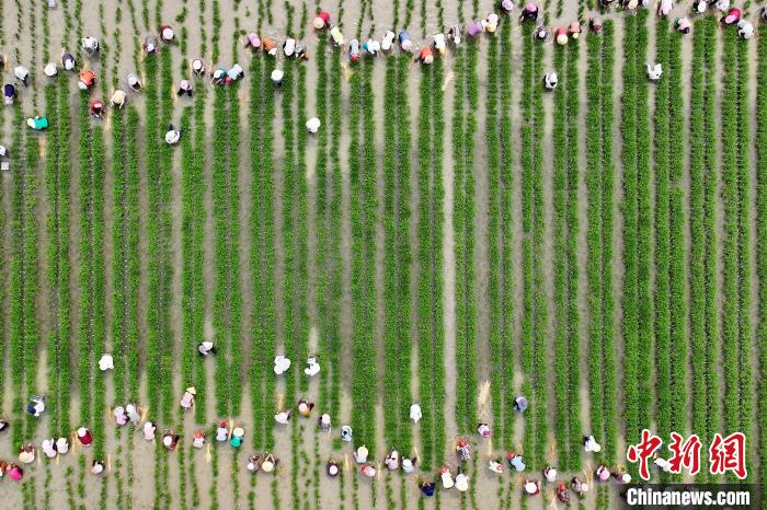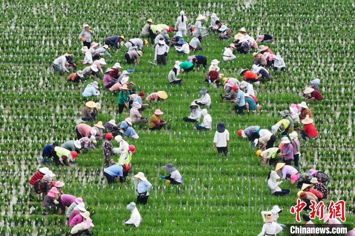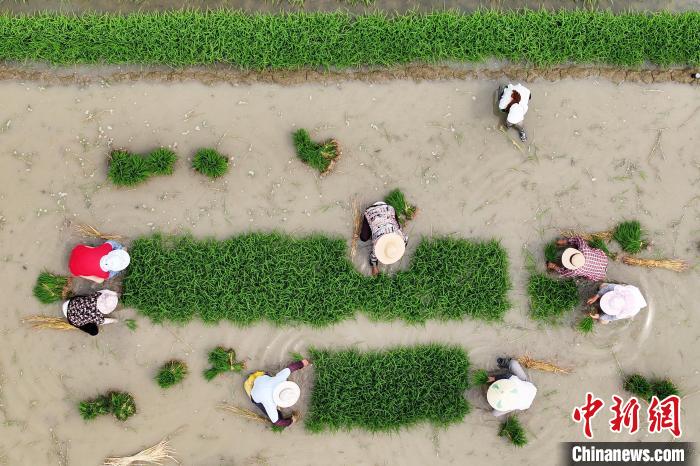 图为万象城awcsport官网师生与插秧工一起在田间劳作。(无人机照片)中新社记者 泱波 摄