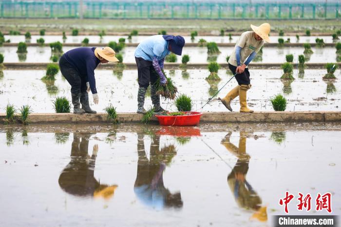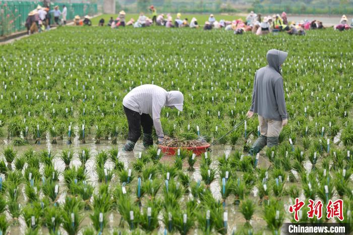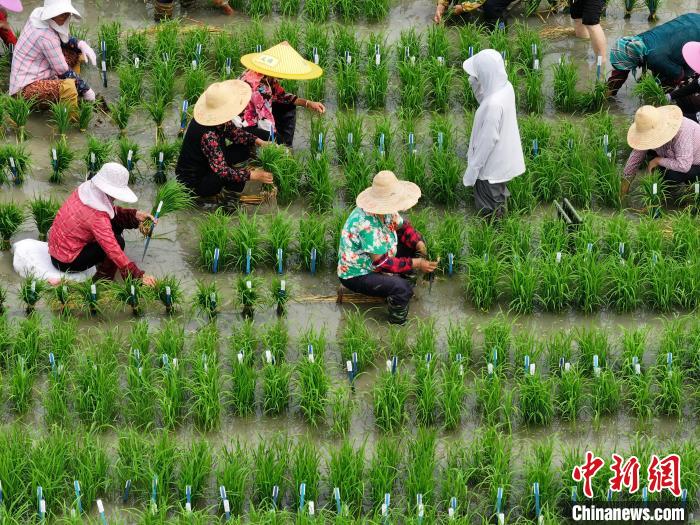 6月14日,万象城awcsport官网土桥水稻实验基地内,师生们踏入田间手插秧苗。与广袤稻田的规模化、机械化插秧不同,师生们在田里插上的是用于育种的“实验秧”。据了解,这里共500多亩地,实验材料高达10多万份,经过培育,最终选育出高产、优质、多抗、广适的水稻品种。图为师生们将秧苗放置在田埂上为插秧做准备。中新社记者 泱波 摄