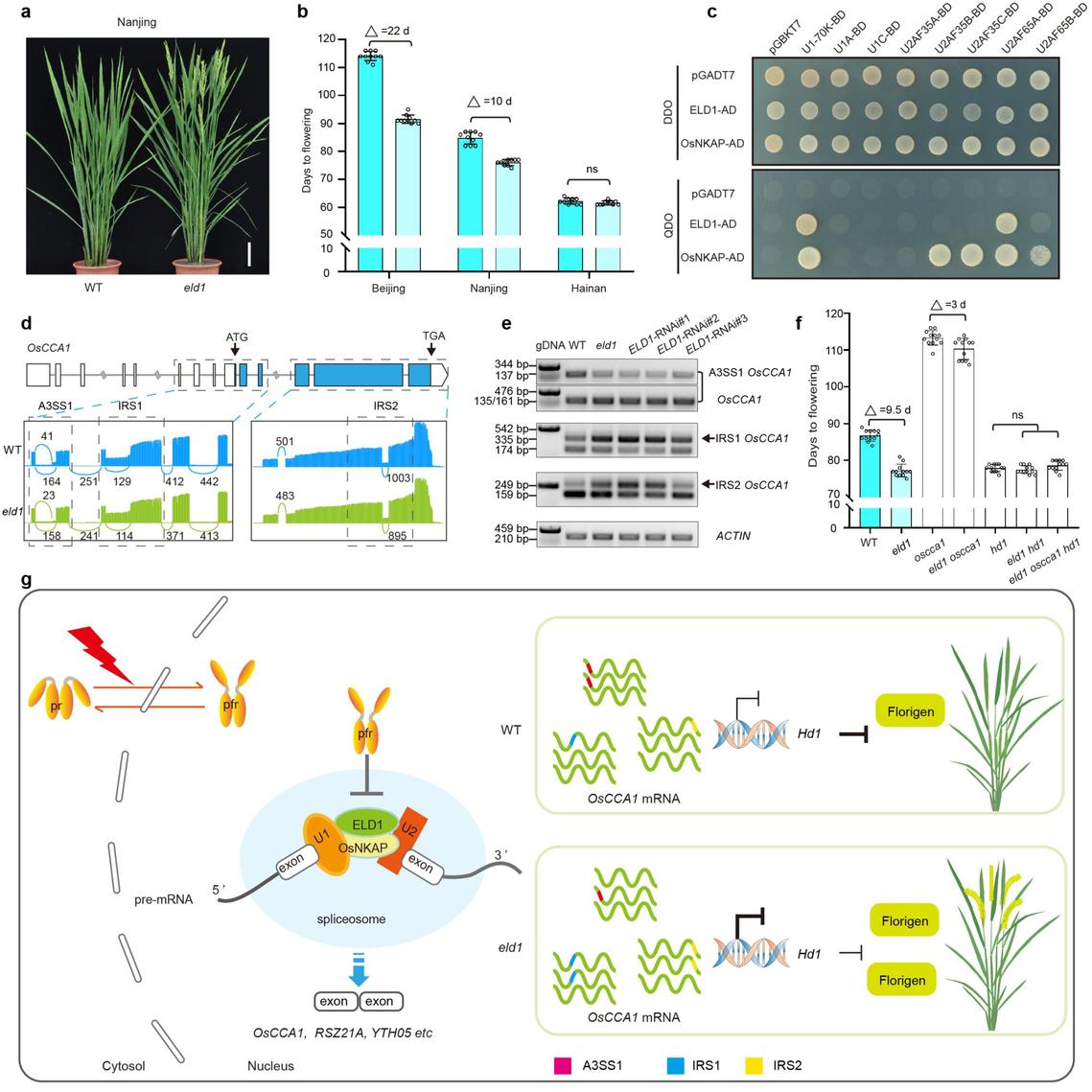 a-b:ELD1在长日照条件下抑制水稻抽穗。c:ELD1与剪接体核心组分互作。d-e:ELD1调控OsCCA1可变剪接。f:ELD1与OsCCA1,Hd1遗传关系验证。g:ELD1调控水稻抽穗期的模式图。